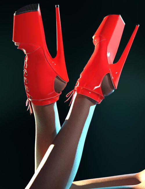 The Peep Toe Pleaser Boots feature twenty material presets plus several material zones for easy customisation. They have handcrafted support for thirty Genesis 9 figures plus a few adjustment morphs to better fit unsupported figures.