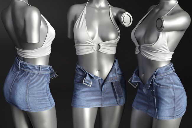 dForce Perfect Escape Outfit for Genesis 9, 8 and 8.1 consists of a classic short denim skirt with belt, a halter top and high heeled shoes. It is about feminine silhuette with modern edge.