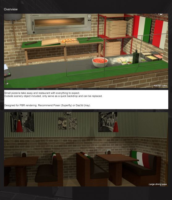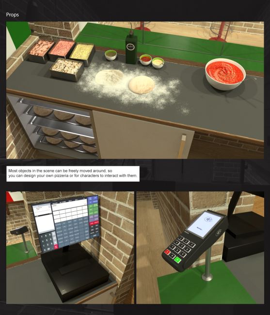 (Poser only) Scene files include lighting controls for each area of the pizzeria, as well as lights for the ovens and the dough fridge.