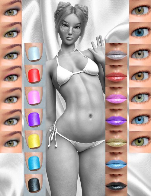 Optimized for Daz Iray PBR Skin Shader with Anatomical Elements, white brows texture, 7 eye, 7 lips, 7 make-up and 7 nails options.