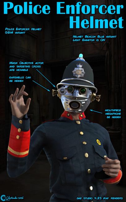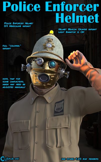 Police Enforcer Helmet is tactical addon for police officers in difficult or dangerous operations, when additional face protection oranonymization might be and issue. It gives it wearer not jsut this additional protection but also superior tactical awareness, low light vision improvement and permanent communication link with operation command. It can also be equipped with mouth piece megaphone cone, when crowd commanding migght be necessary, or with earshells for improved hearing as well as targeting device for sharphooters or sniupers and personal camera for documentation of situation at plece of operation. It is provided in two color variants for metropolitan or city engagements and for off land colonial use. Whole set consists of protective underhood, reinforced mask with communication, vocal and visual equipment and distinctive constable helmet also made from reinforced material.