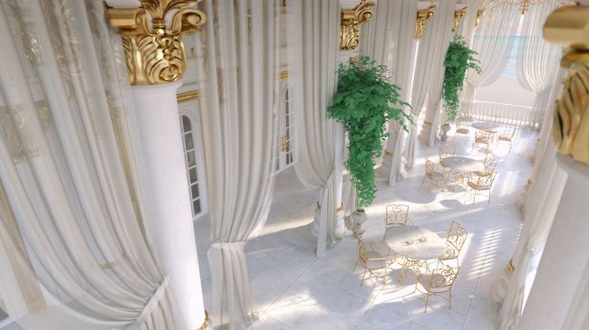 Baroque Environment Bundle unites three richly crafted scenes — a white baroque balcony adorned with gold ornament, a Parisian white bedroom with refined baroque details, and a dark grey baroque living room glowing beneath a crystal ceiling lamp.
