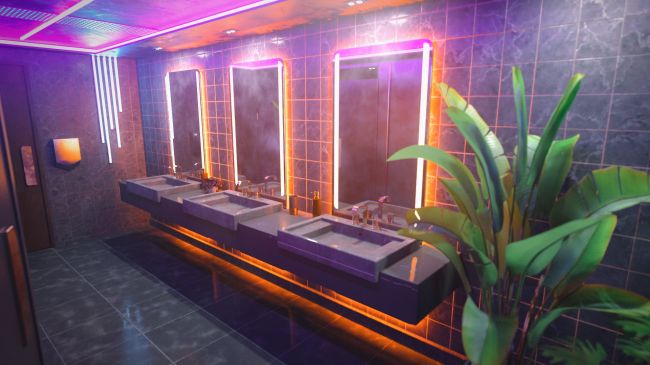 Complete your nightlife scenes with this stylish Night Club Bathroom, designed to match the bold energy of the club itself. Featuring moody lighting, sleek fixtures, and touches of tropical decor, this space blends urban edge with exotic flair.