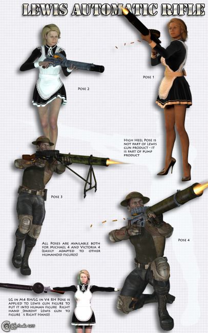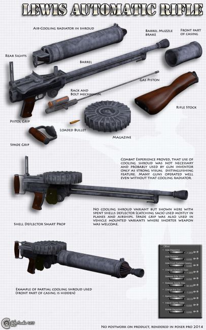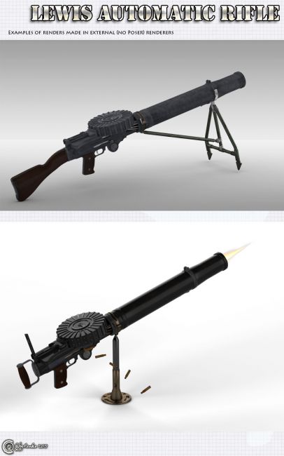 Lewis Mechanical Rifle is well known and most popular World War I universal light machine gun. Although it was invented by and American it was manufactured largely in Great Britan and used around the world. It was first used in combat in World War I, and continued in service with a number of armed forces through to the end of the Korean War with with sporadic use even in later conflicts until the end of 20th century. It is visually very distinctive almost iconic, thanks to wide tubular cooling shroud around the barrel and a top-mounted drum-pan magazine. It was commonly used as an aircraft machine gun, almost always with the cooling shroud removed, during both world wars. Out model is made with great technical and factography care to be as much similar to real weapon as possible. Same as the real prototype even poser model can be of great use and service to you. You can use it for any historical base project as well as for fantastic or steampunk oriented works. You can put it into hands of any rendered character to get seriously looking "big gun" prop or mounted to any vehicle from bikes, to cars, planes, airships and so on. I hope you will find many uses for this great, reliable and paradigmatic weapon.