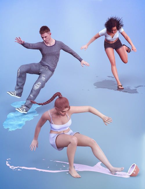 This set includes 22 unique feminine and 22 masculine poses, each with mirrored versions, plus three customizable props: an ice patch, a viscous yoghurt spill, and a liquid splash. Use them to create comical slips, dramatic falls, or any unexpected mishap in your renders. The props can be recolored to fit any scenario, from water to oil or soda.