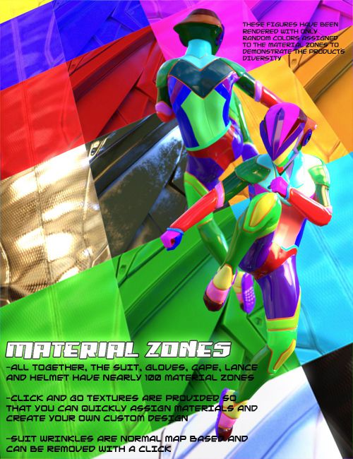 The Regal Starlance can be a tokusatsu task force warrior, a hunter of xeno life forms and rogue machines, or anything you want him to be. Who knows if he is human or android himself? Who knows if there's just one? A large selection of MAT zones allow you to create your own customized color-coded costumes for this stylishly mysterious dForce caped warrior and his lance.