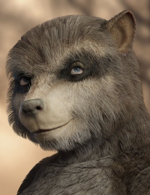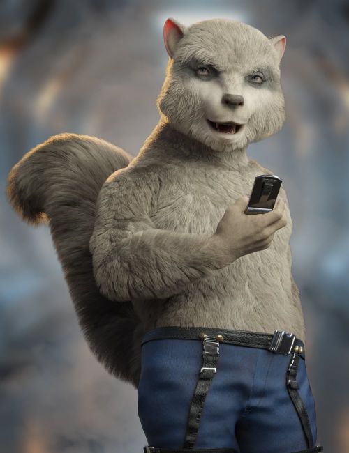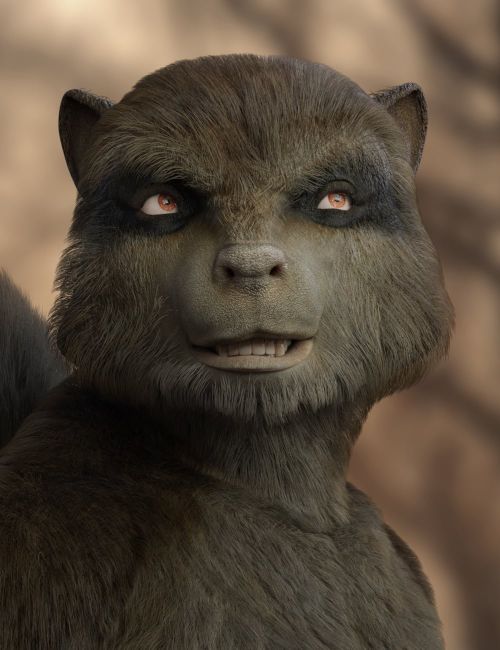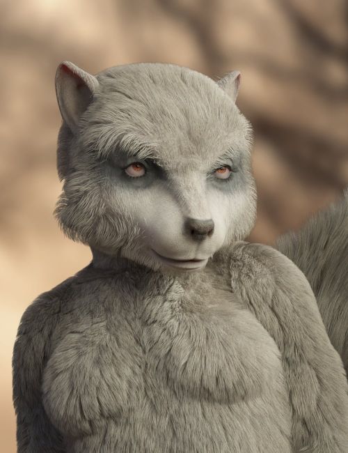 The set includes a full character with morphs for both male and female body shapes, richly detailed fur using dHair for the body and tail, and a geografted tail that completes his silhouette. Multiple natural skin tones, from classic greys and tans to bold black and white, are joined by a vibrant purple option for stylized or alien concepts. Five eye presets help fine-tune mood and attitude.