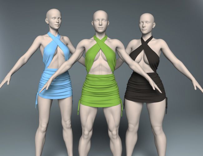 Turn up the allure with this daring and stylish mini dress featuring a bold crisscross halter design and body-hugging ruched details. The sleek, form-fitting silhouette highlights every curve, while the open-front cut and tied side strings add a playful, confident edge. Fully dForce-enabled for realistic draping and natural movement - perfect for sultry fashion renders, night-out scenes, or bold character portraits.
