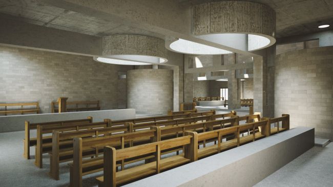 Within, the space is thoughtfully furnished with benches and lecterns, facilitating both worship and gatherings.