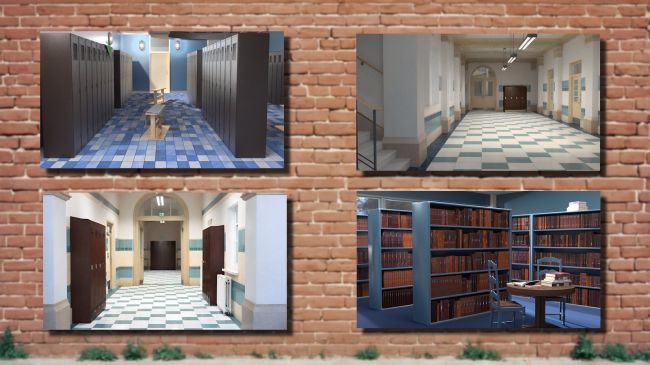 Hallways, cafeteria, library, showers, locker-room, etc. All rendered in Poser 13 and refined and upscaled in Krita. 17 png images 4096 by 2304. Merchant Resource, no attribution required.