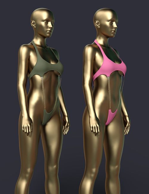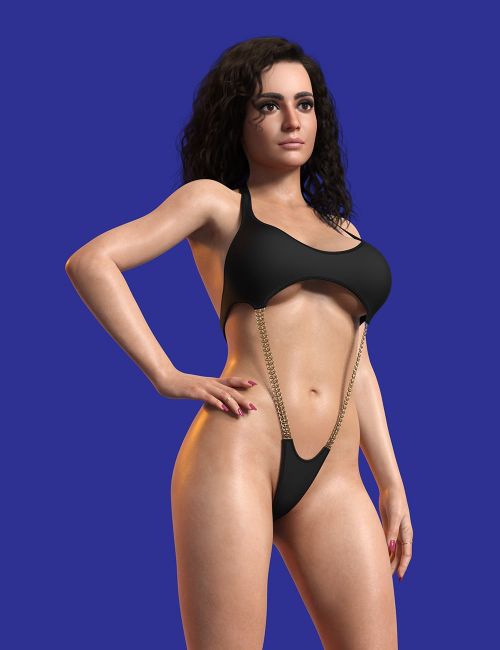 Designed exclusively for Genesis 8 Female and Genesis 8.1 Female, this monokini combines minimalist black fabric with luxurious gold chain details that cascade from the plunging neckline to the ultra high thong cut.