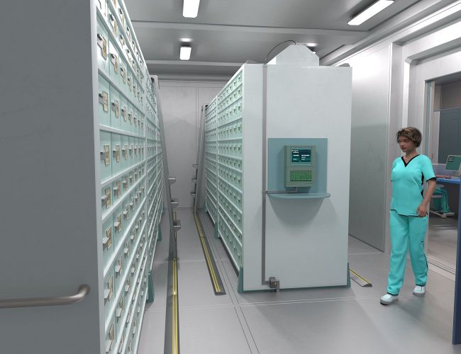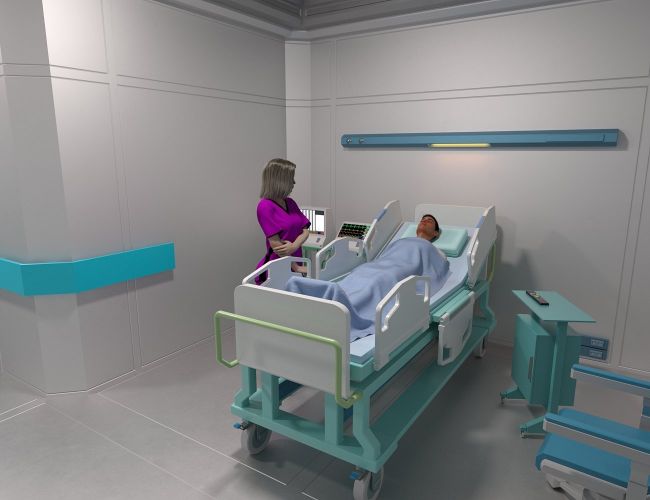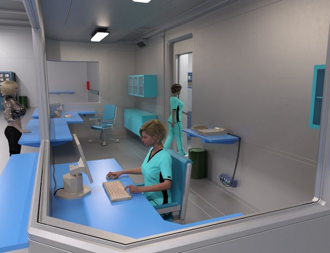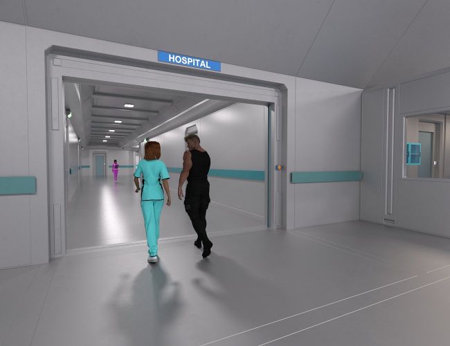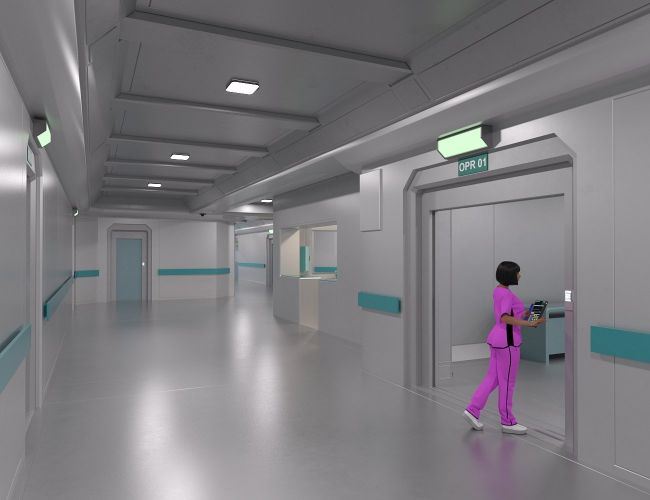 This fourth add-on for the Space Road stop is the hospital level. It consists of a waiting room that is connected to the elevator of Add-on 03. A pharmacy where there is a little table for creating medications and eight lockers with seventy-seven drawers each. A consultation room with a desk and an auscultation table. A rest room for employees with a table, chair, locker and toilet A small maintenance room. Operating rooms with a surgical machine fully articulated with two rotating scanners, table and fifteen arms. A recovery room model and finally a central hub with corridors that connect all the different rooms.