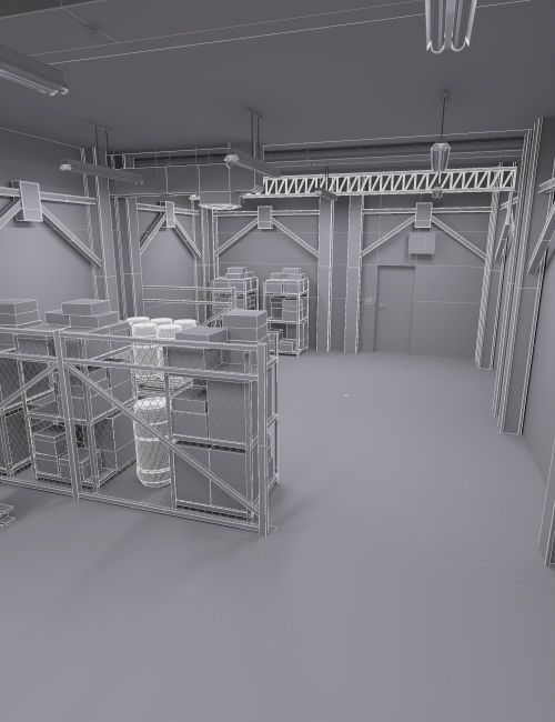 Stockroom Interior features a detailed interior scene with props such as shelving units, boxes, barrels, fences, pallets. All Optimized for Studio with Iray.