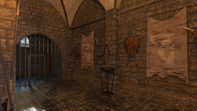 This atmospheric 3D environment features towering stone pillars, vaulted ceilings, and iron-barred storage areas, evoking the grandeur of a fortress stronghold. Weapon racks brimming with spears, polearms, and medieval banners add authenticity, while the warm torchlit ambiance enhances the immersive experience.
