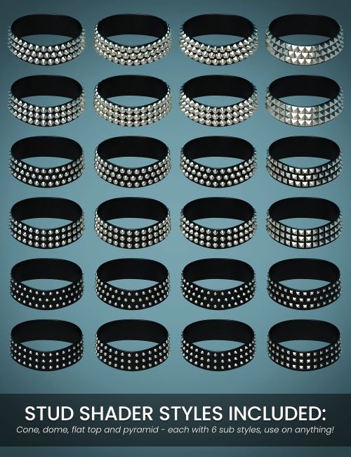 With STUDify you get a set of dForce smart prop accessories for Genesis 9 (three different choker widths and wrist cuffs), a leather shader, the STUDify shader, and a couple of geometry shell (geoshell) creation scripts.