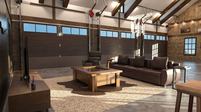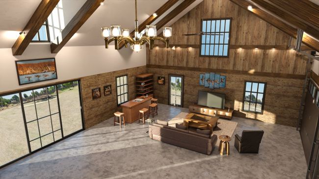 With cozy seating areas, modern cabinetry, and versatile open spaces, this gatehouse blends countryside charm with contemporary design - ideal for creating scenes of upscale retreats, residential garages, or welcoming interiors.