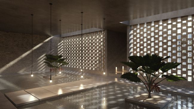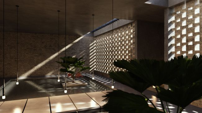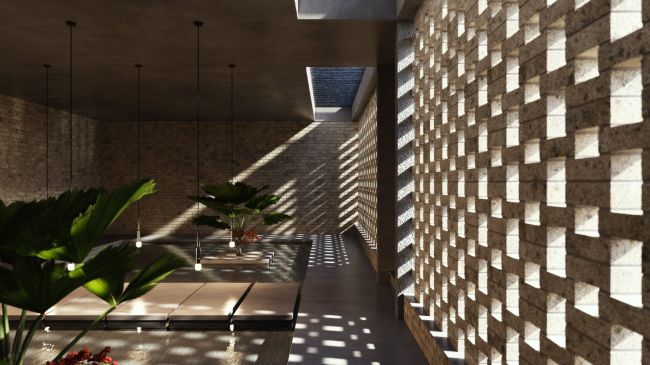The ornate brick building features intricate architectural details, that allow sunligh to stream in, casting a dynamic interplay of shadows and highlights across the interior.