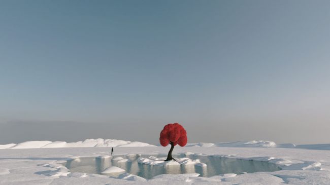 On the small lake there is a beautiful red tree.