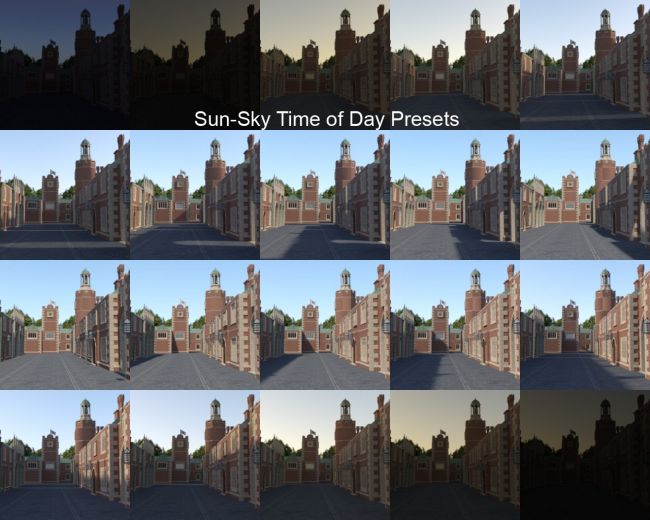 There are a number of options, including adding different levels of haze, different flag designs and drapes, and different crests on the buildings. I have also included an hourly set of Sun-Sky time of day presets, and for evening and night scene,s the lanterns can be turned on at two levels of brightness.