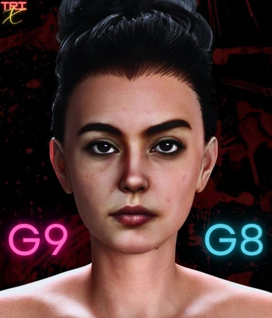 - Achieve better mesh deformations by combining the G8.1 version with G8.0 UV's and textures, while utilizing the G9 version for extreme close-up shots, thanks to her double mesh density, and much more natural eyes, hands, and feet.