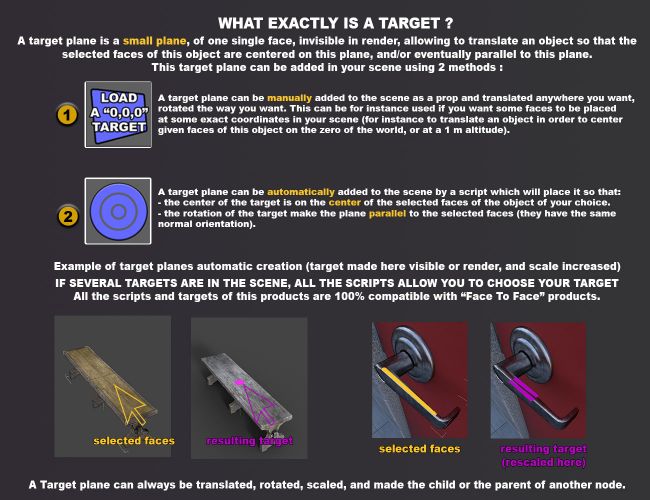 Face to Face Autopose Arms provides all the tools you need to create from scratch or to modify the arms pose of your figure in a super simple way: a face to face principle. Any face of any object or any location in space can be automatically reached (if reachable) by the faces you select on the hand of your figure, or on a child node of the hand. The destination location is a target plane that can be manually loaded or automatically created on the selected faces of any scene node. Tools are provided to process any single frame (single pose) or full range of animations. You can process the arms only, but also the arms, and/or hands, and/or fingers (you can choose), and even better, it works with the selected faces of any child object of your hand, which is ideal to autopose the arm to put a gun on someone’s head, or a racket on a ball.