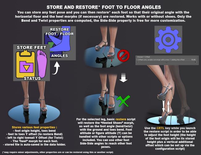 Face to Face Autopose Legs provides the tools you need to automatically pose the legs and feet of your Genesis 9 figures. As in the version of the product for the arms, any face of any object, or any location in space, represented by a small target plane, can be automatically reached (if reachable) by the faces you would select on the foot or the shoes of the figure. For the laziest, you can select only the leg without selecting any face on the foot and the shoe, and in this case, the toes origin will be used to reach the target, and you can work with an additional Y offset to compensate for the shoe and foot thickness. The Autopose legs suite of scripts includes tons of options and additional tools, such as the possibility to use only the target height, to restore some specific – stored - foot to floor angles and foot-heeled morphs, to maintain original foot orientation while converging, etc… You can easily create or modify poses, and even if no animation tools are basically included, the scripts will work at any frame you want in your timeline.