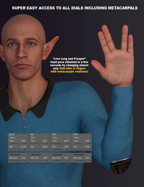 Finally, the V3Digitimes Hands Controls For Genesis 9 is a simple tool enhancing drastically the pose process of the fingers of your Genesis 9 figures. Gathering all the dials and the classical Hands Pose Controls in a single interface, with baking and zeroing possibilities, you will finally pose fingers in the blink of an eye.