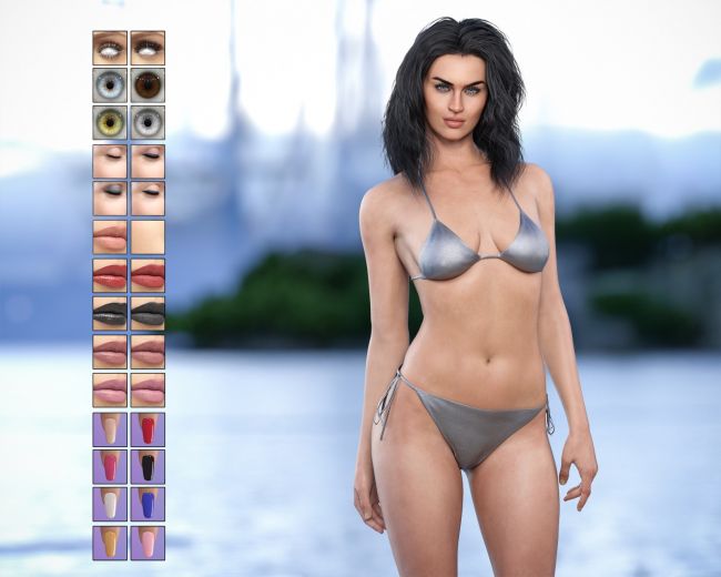 She is created for Genesis 8 Female and Genesis 8.1. She comes with two skin shaders for each Genesis version. Included are several make-up options, eyelash options and nail colours.