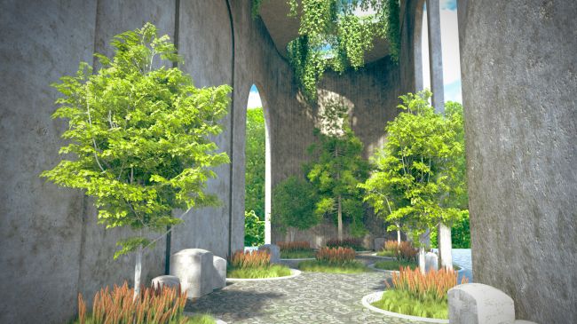 Explore the beauty of contrast in this Vegetation Scene with Concrete Arch Structures, where lush greenery weaves through weathered, modern architecture.