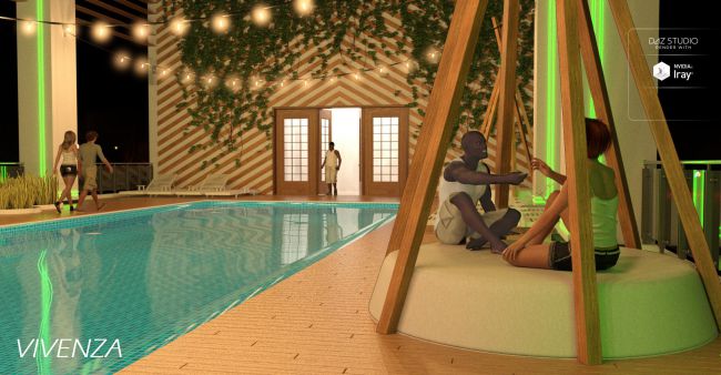 This environment has a decorative pool, tanning chairs, some Pouf chairs where you can place more than 1 character, 3 types of plants distributed in 6 pots and 2 ivy on Wall.