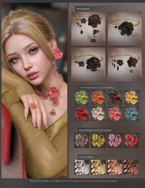 Another beautiful and unique jewelry set from the team at VRVirtuosos. A classy and interesting flower-based jewelry set. This kit has a fully rigged flower with 162 bones for the ultimate in ability to shape in new and interesting ways, and 2 material zones (rim and flower). Also included in the kit are some beautiful faceted beads that will give your projects a stunning look. Along with the usual pieces for bracelet, rings, earrings, bobby pins, and neckbands. The set comes with 4 presets for each piece to give you a starting point or to use as is. Everything is poseable to give you the ultimate in versatility. We have also included 20 bead shaders, 12 flower materials, and 4 metal shaders.