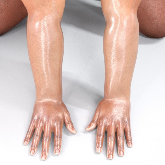 … for a total of 12 permutations. The material files included will apply any of these on a target figure that already has textures and materials loaded, using the TOP COAT channel of the shader onthe ARMS material selection. Before attempting to use any of these materials, **make sure that your character's ARMS are not already using the TOP COAT branch**, as any of these files will overwrite what is in place on the character in your scene. Since Top Coat is normally only used for just this type of purpose (showing wet coating on an already-textured material) it shouldn't already be in use, but check anyway.