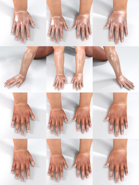 A set of DAZ Iray partial material files for Genesis 8 Male, that apply a variety of Top Coat settings using a grayscale mask files to give the effect of wetness on the hands in variety of combinations of one or both hands, including: