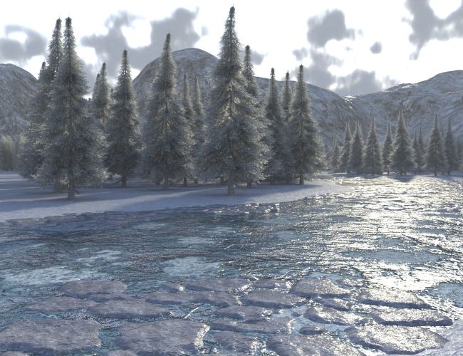 Discover this beautiful snow-covered forest with a frozen river and towering mountains all around.