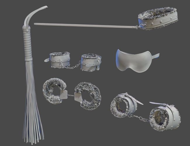 The set comes with 6 unique props, the whip and the choker leash are rigged for some movement. There are 5 colors of fur for the Handcuffs, Choker, Wrist, and Ankle restraints. The whip has a wearable preset and a hierarchical pose preset. The chains of the ankle and wrist restraints have mat presets to be turned on and off.