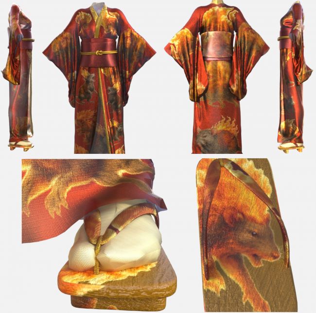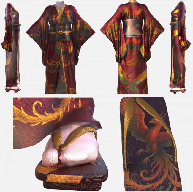 Finally, some "Height&Normal" shader presets are also included, allowing to apply the normal and displacement maps on other existing materials compatible with the kimono. For example, you could use a pattern from the Kachouga volume, and apply the Height&Normal preset from the Japan Mythical Creature one or vice versa. You could also use the Height&Normal preset from one of them on the original material of the kimono. You can do everything you want!