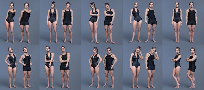 This pose set splits into upper body, lower body, left arm, right arm, left leg, right leg, left hand, right hand, eye, and head pose partials, which can be mixed, matched, and paired with different partials for even more exciting possibilities.